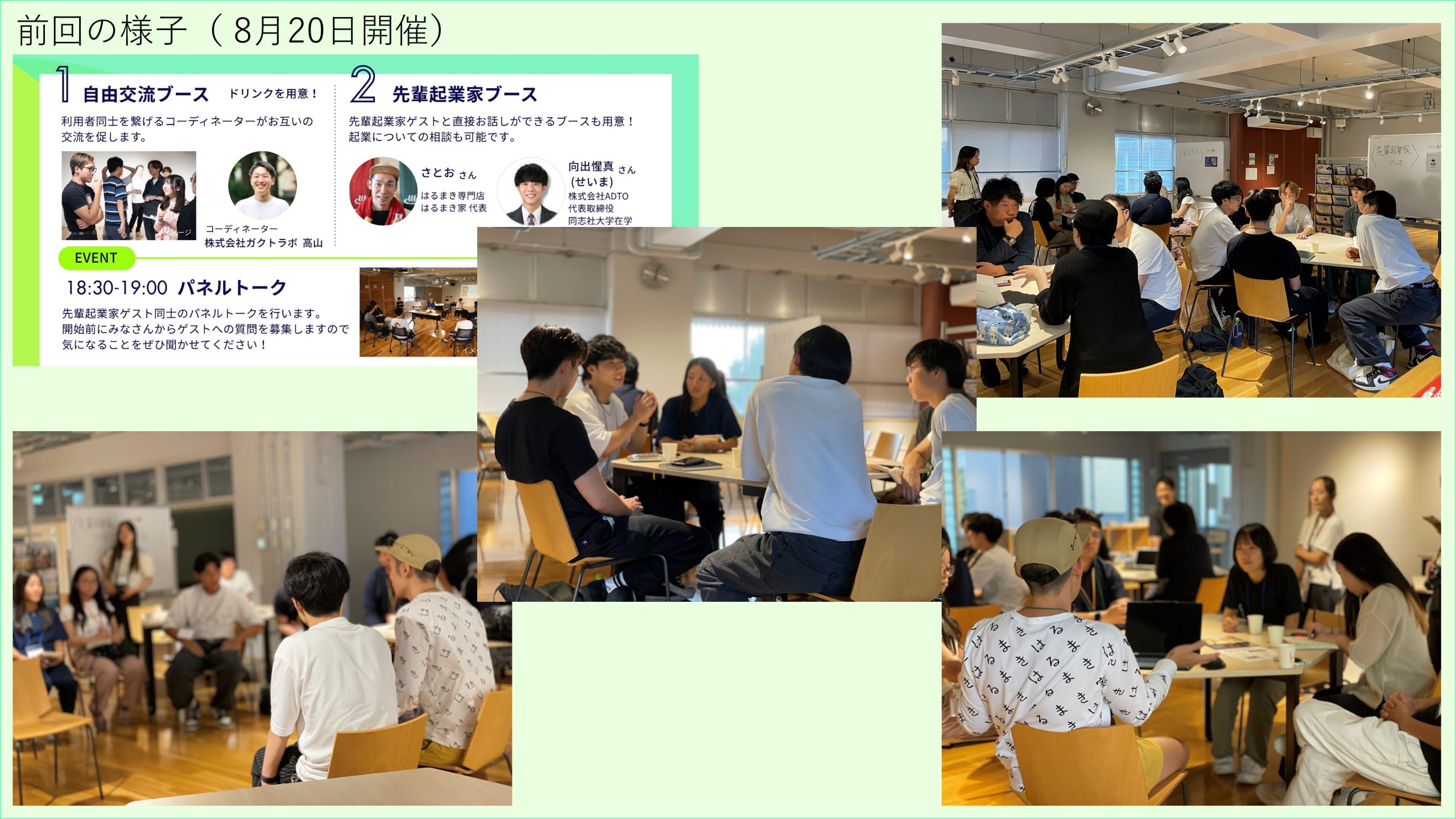 内 容 | ゲスト起業家のパネルトーク(18:30-19:00) 自由交流ブース、先輩起業家ブース |